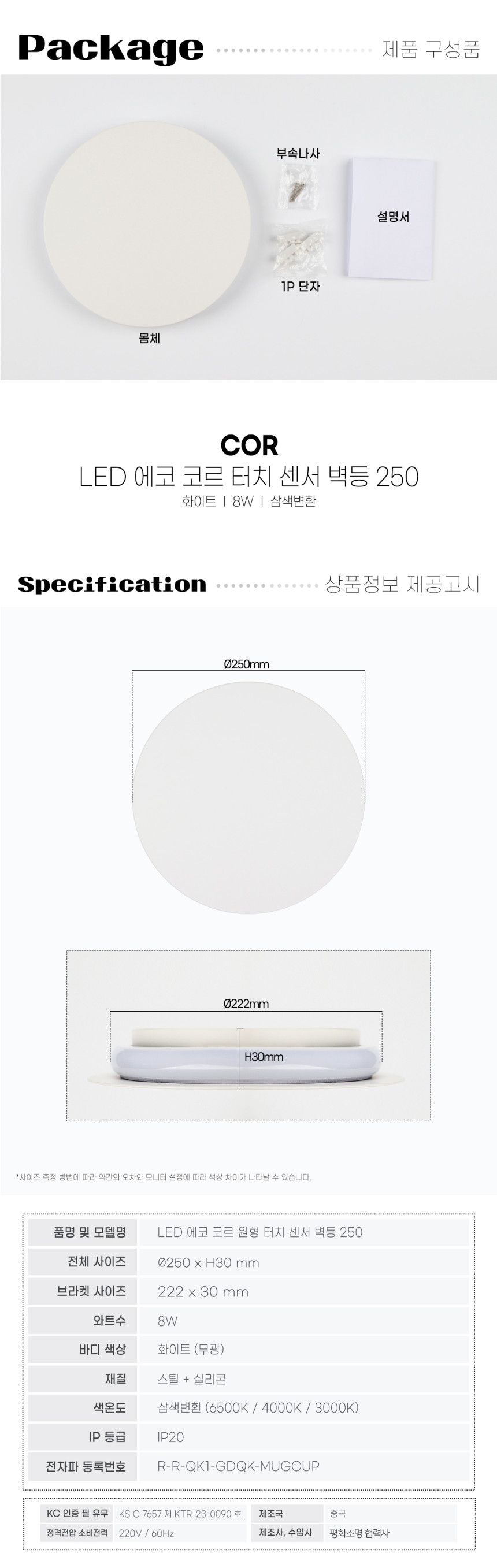LED 에코 코르 원형 터치 센서 벽등 250파이 8W 플리커프리